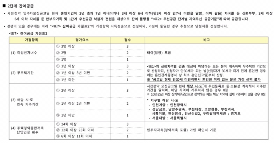 - 사전청약 입주자 모집공고일 현재 혼인기간이 2년 초과 7년 이내이거나, 3세 이상 6세 이하(만3세 이상 만 7세 미만) 자녀를 둔 신혼부부, 3세 이상 6세 이하 자녀를 둔 한부모가족 및 1단계 우선 공급 낙첨자 전원