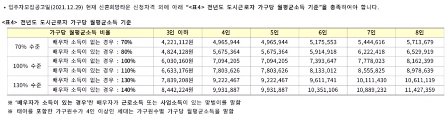 3. 무주택세대구성원 전원의 월평균 소득이 도시근로자 가구당 월평균 소득 기준의 130%(맞벌이 부부의 경우 140%) 이하