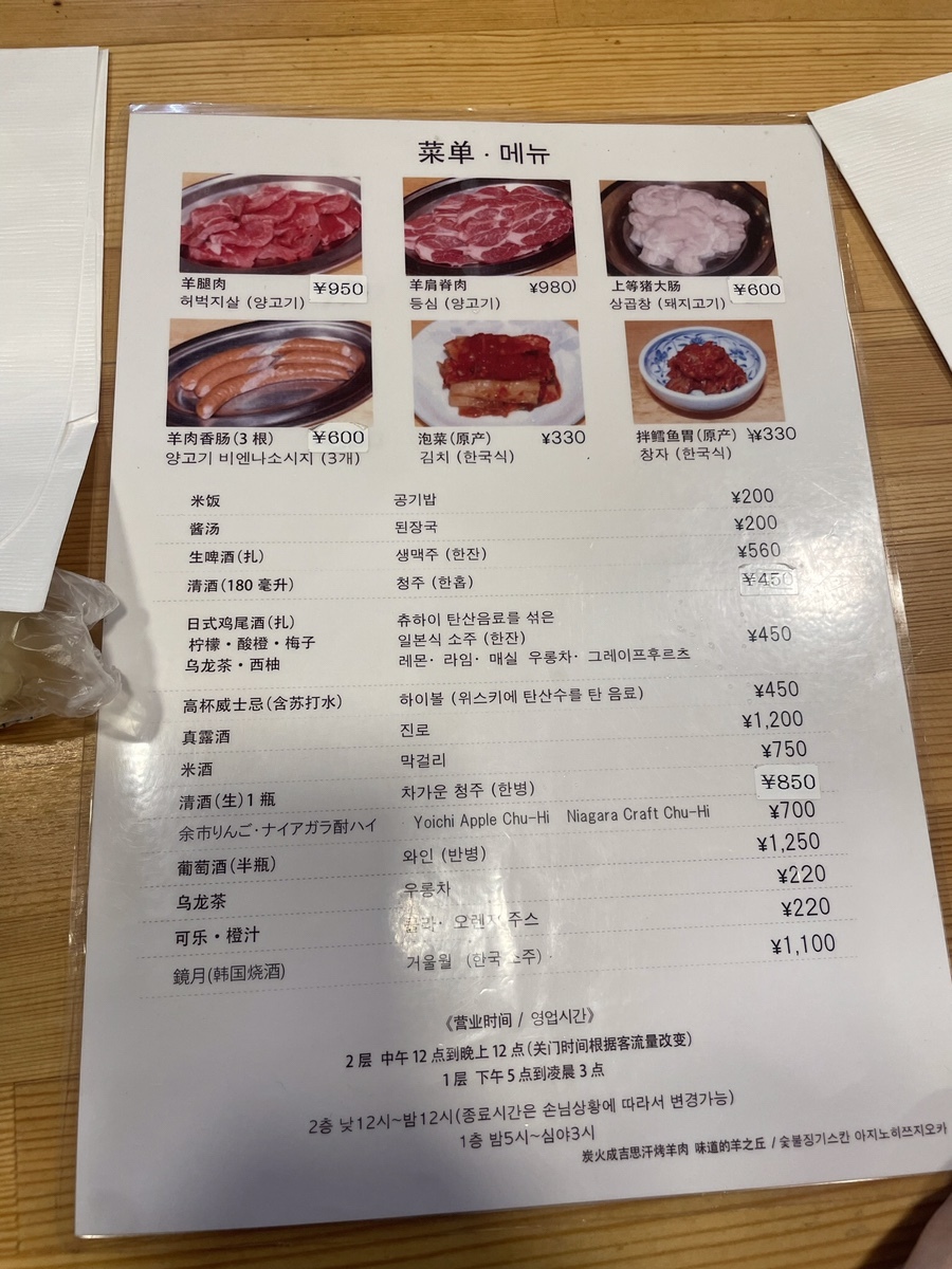 한국어 메뉴를 받아서 허벅지살 2인분, 등심 2인분, 비엔나소시지 1, 김치를 시키고 상 곱창 2인분을 추가했다. 여긴 야채도 무료 리필이 가능하다. 개중에는 돈을 내야만 야채 리필을 할 수 있는 가게도 많다고 한다.