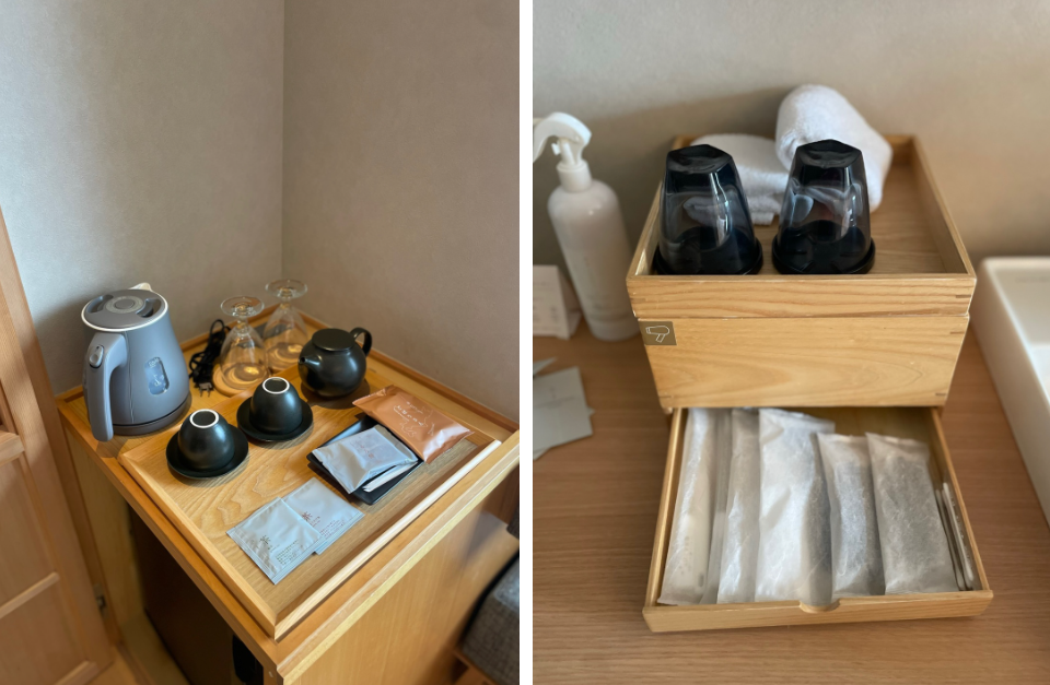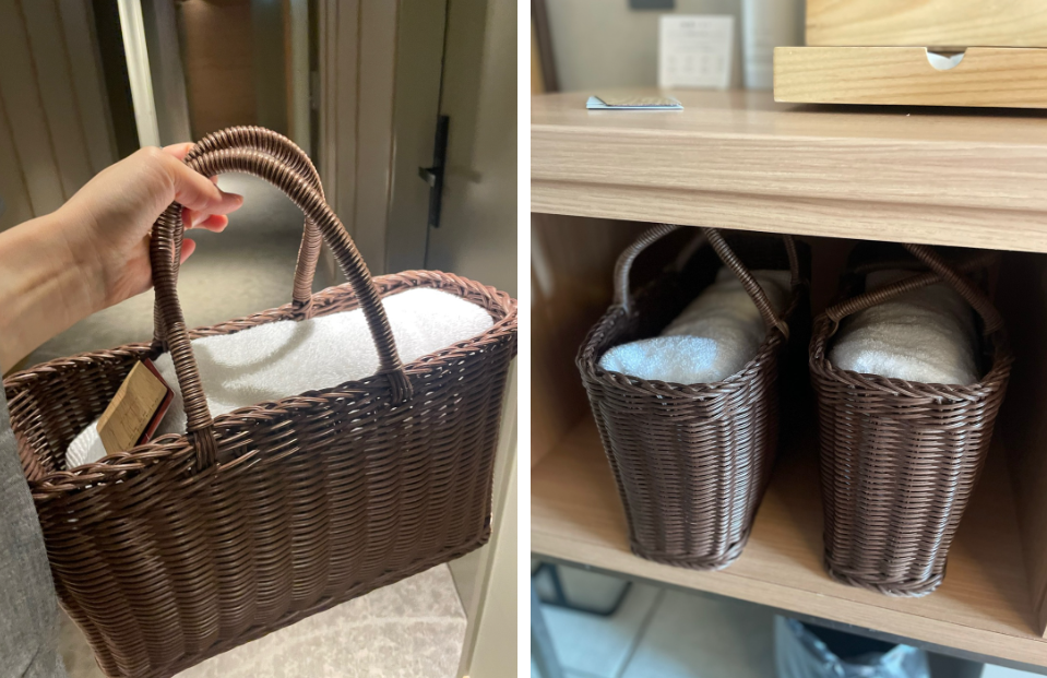 온천하러 갈 때 들고갈 바구니도 인 당 한개씩 구비돼 있고 안엔 비치타월 등이 들어있었다. 티와 웰컴푸드도 있는데 웰컴푸드는 그냥 쏘쏘였다.