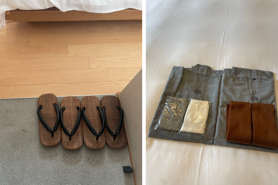 침대에는 숙소에서 입을 수 있는 유카타 비스무리한 옷이 놓여있고, 나막신(게타) 비슷한 신발도 있는데 뭔가 이 나막신이 왜이렇게 귀엽지.