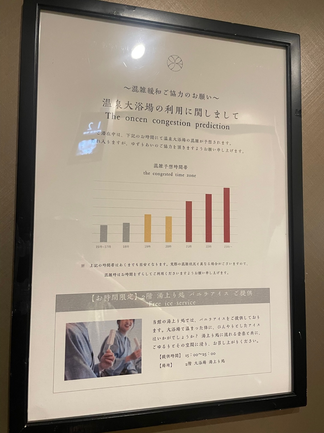 우리가 이곳에 온 목적은 오로지 온천과 힐링..! 짧게 룸 구경을 하고 신이 난 우리는 2층 대욕장에 호다닥 온천을 즐기러 가 보았다. 온천 이용시간은 체크인 시간인 15시부터 다음날 아침 10시까지다. 거의 오픈하자마자 달려갔더니 이용객이 아무도 없었다. 이렇게 온천 혼잡도를 대략 그려준 표가 있는데 저녁시간에 사람이 가장 많은가 보다.