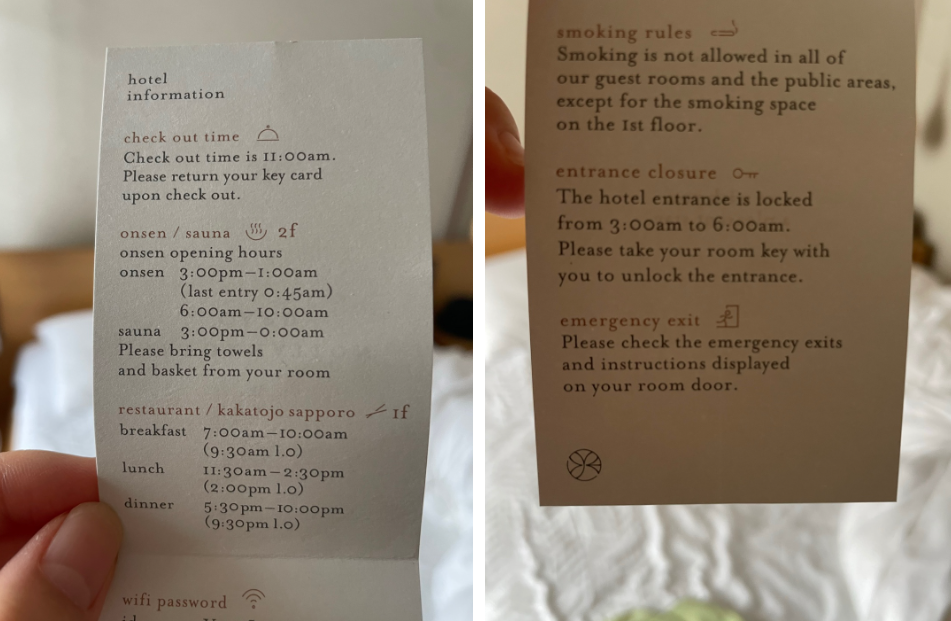 조식은 먹어보지 않아서 잘 모르겠다. 전반적인 평을 남기자면 위치나 접근성이 좋아 삿포로 여행 시 하루 쯤 휴식하기 좋은 료칸인 듯하다. 가격이 막 싸진 않지만 시설도 쾌적하고 나름 만족! 오늘은 이렇게 마무리.
